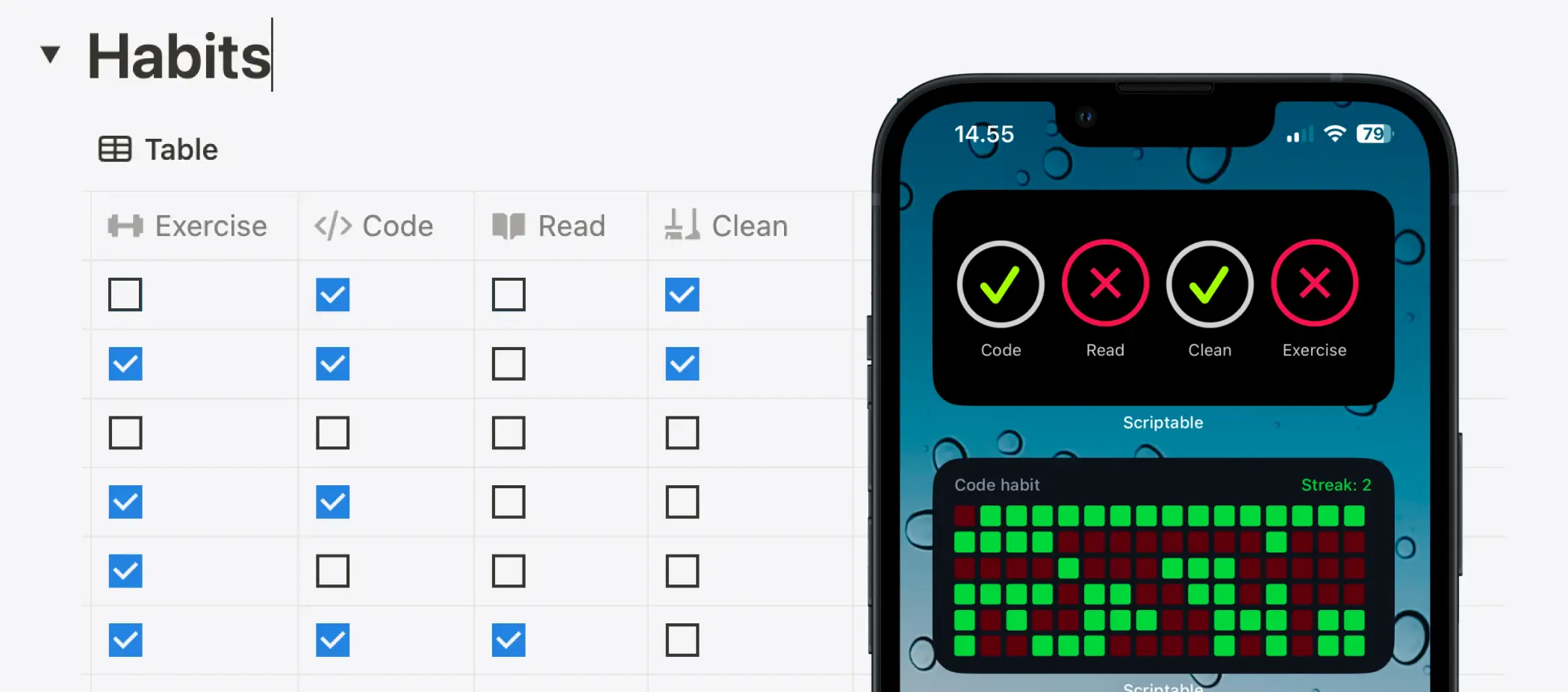 Two widgets for your notion habit tracker. 1) A widget showing todays habit status 2) A widget showing a habit grid for specifik habit.